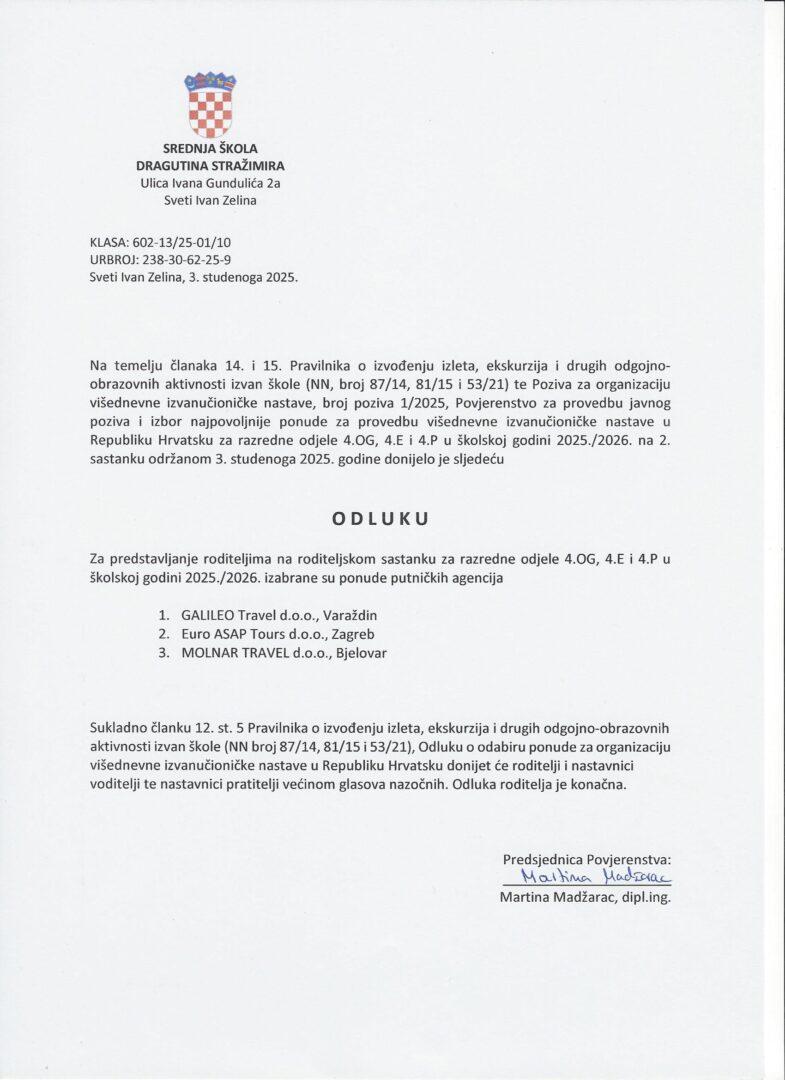 U privitku se nalazi Odluka o predstavljanju i odabiru ponude za organizaciju višednevne izvanučioničke nastave u Republiku Hrvatsku za razredne odjele 4. OG, 4.E i 4.P u šk. godini 2025./2026.